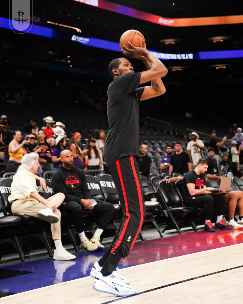 赛前,火箭官方社媒分享球员赛前训练的组图,凯文-杜兰特等球员出镜。